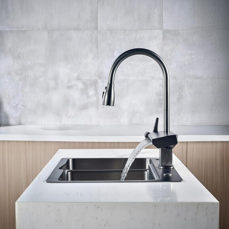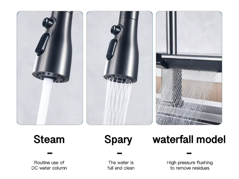 One sleek pull-down head with three modes: Gentle Steam for everyday precision with no splash. Powerful Spray for fast, thorough rinsing. Dramatic Waterfall for high-pressure cleaning that blasts away grease and residue instantly. Magnetic docking, premium finish, effortless switching.