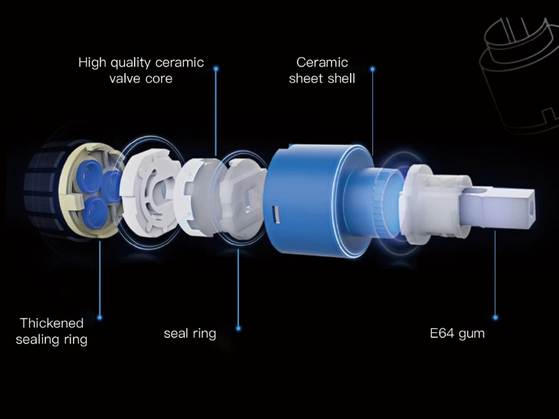 Key features include a high-quality thickened ceramic valve core, ceramic sheet shell, double-layered sealing rings, and specialized E64 gum for ultimate durability and smooth flow control.
