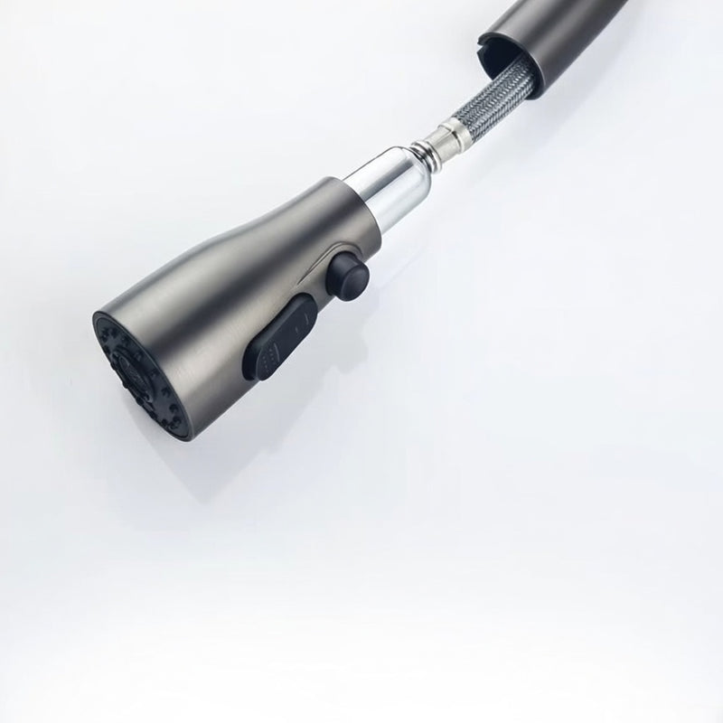 Premium brass in sleek matte grey finish. A modern pull-out faucet that combines smart technology with elegant design. It includes a clear digital LED display for real-time water temperature monitoring. The sprayer offers three modes: powerful stream for filling, full aerated spray for rinsing, and high-pressure waterfall cascade for easy residue removal.