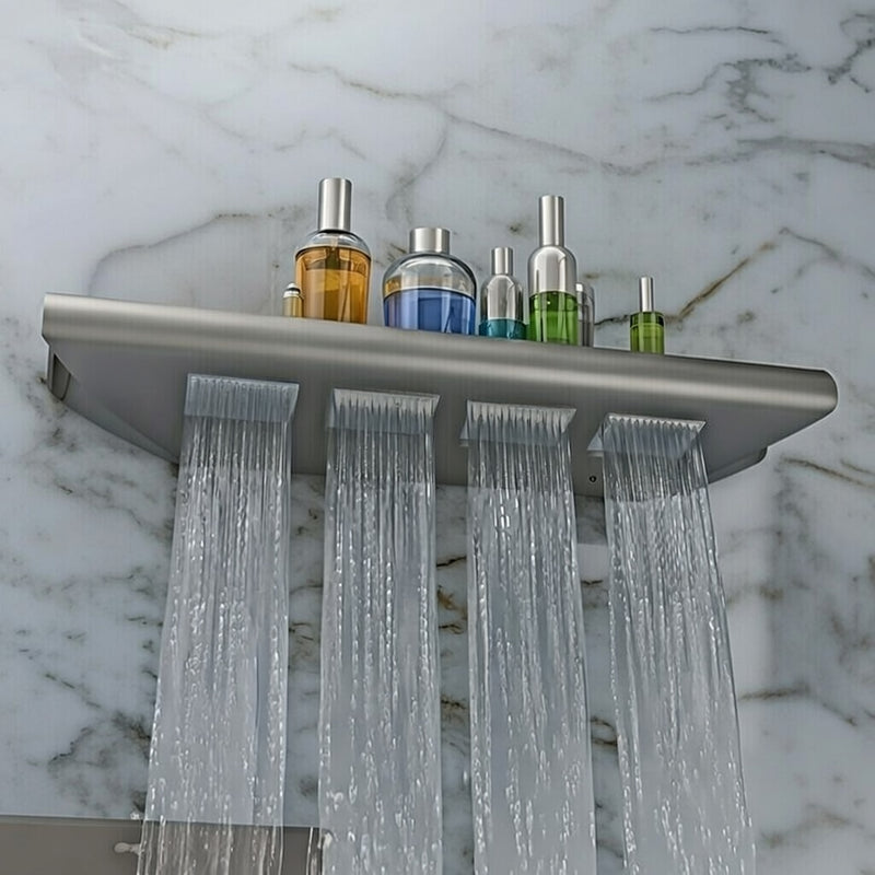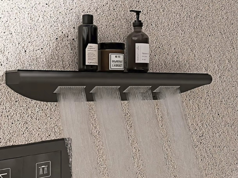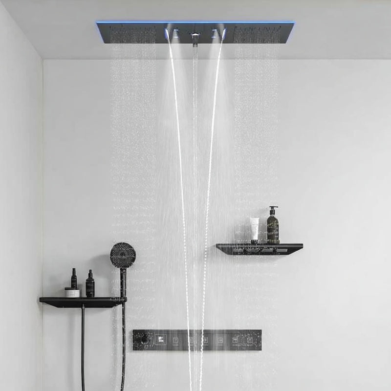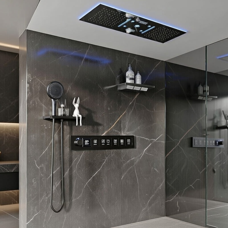 Elevate your shower ritual with sleek, matte-black elegance. A minimalist overhead shelf perfectly cradles premium grooming essentials while the wide, ultra-thin rain panel delivers powerful, even cascades of water, turning every shower into a luxurious, spa-like escape.