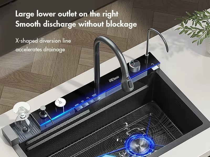 The Rovion Luxury Kitchen Sink (750mm x 450mm) redefines modern kitchen functionality with hydropower technology that requires no external power. Its advanced features include a versatile waterfall spout, ambient LED lighting, precise temperature control, and a high-pressure cup washer for effortless cleaning.